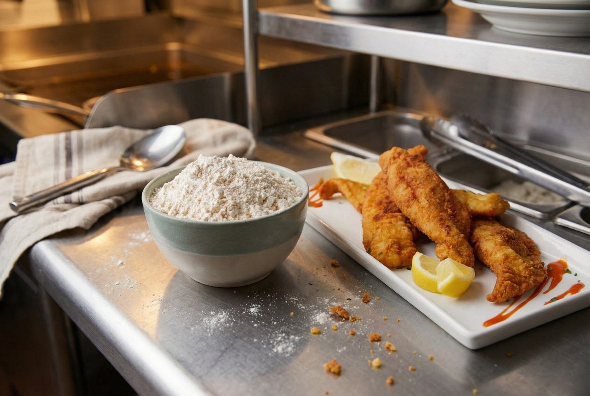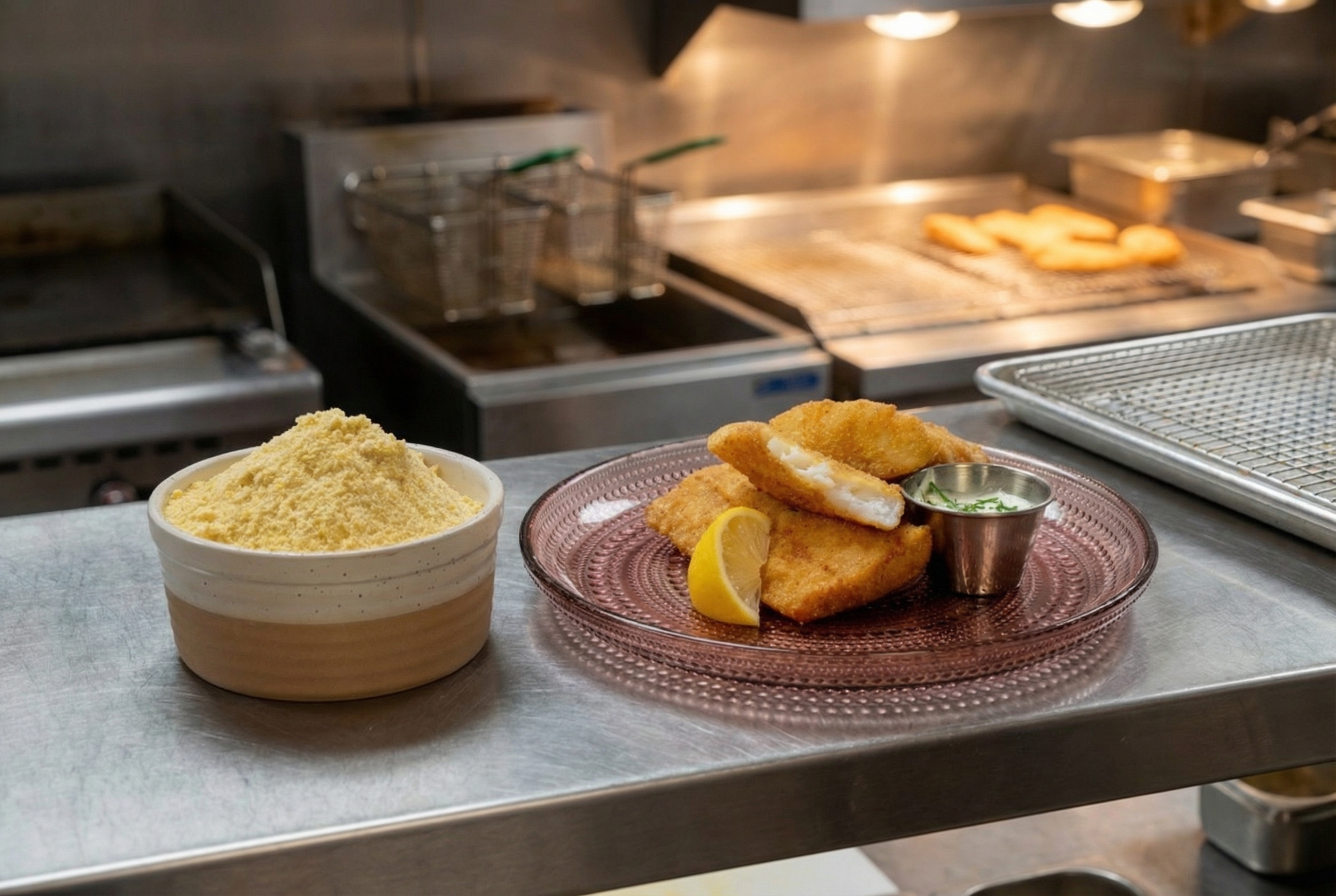 A corn flour and corn meal breader that creates crispy breading for fish or any breaded foods.